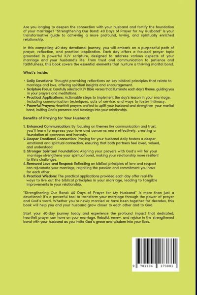 Strengthening Our Bond: 40 Days of Prayer for My Husband Are you longing to deepen the connection with your husband and fortify the foundation of your marriage? "Strengthening Our Bond: 40 Days of Prayer for My Husband" is your transformative guide to achieving a more profound, loving, and spiritually enriched relationship. In this compelling 40-day devotional journey, you will embark on a purposeful path of prayer, reflection, and practical application. Each day offers a focused prayer topic grounded in powerful KJV scripture, designed to address various aspects of your marriage and your husband's life. From trust and communication to patience and faithfulness, this book covers the essential elements that nurture a thriving marital bond. What's Inside: ¿ Daily Devotions: Thought-provoking reflections on key biblical principles that relate to marriage and love, offering spiritual insights and encouragement. ¿ Scripture Focus: Carefully selected KJV Bible verses that illuminate each day's theme, guiding you in your prayers and meditations. ¿ Practical Applications: Actionable steps to implement the day's lesson in your marriage, including communication techniques, acts of service, and ways to foster intimacy. ¿ Powerful Prayers: Heartfelt prayers crafted to uplift your husband and strengthen your marital bond, inviting God's presence and blessings into your relationship. Benefits of Praying for Your Husband: 1. Enhanced Communication: By focusing on themes like communication and trust, you'll learn to express your love and concerns more effectively, creating a foundation of openness and honesty. 2. Deeper Emotional Connection: Praying for your husband daily fosters a deeper emotional and spiritual connection, ensuring that both partners feel loved, valued, and understood. 3. Stronger Spiritual Foundation: Aligning your prayers with God's will for your marriage strengthens your spiritual bond, making your relationship more resilient to life's challenges. 4. Renewed Love and Respect: Reflecting on biblical principles of love and respect can rejuvenate your marriage, reigniting the passion and commitment you have for each other. 5. Practical Wisdom: The practical applications provided each day offer real-life ways to live out the biblical principles in your marriage, leading to tangible improvements in your relationship.