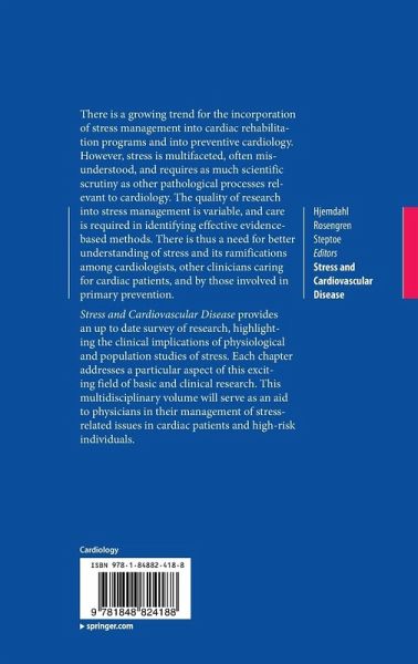 The main aim of this book is to evaluate the concept of stress and provide tools for physicians to identify patients who might benefit from stress management. This will incorporate a detailed description of the physiological and pathophysiological consequences of acute and chronic stress that might lead to cardiovascular disease. The book will aim to critically evaluate interventional research (behavioural and other therapies) and provide evidence based recommendations on how to manage stress in the cardiovascular patient. Our intentions are to define and highlight stress as an etiological factor for cardiovascular disease, and to describe an evidence based "tool box" that physicians may use to identify and manage patients in whom stress may be an important contributing factor for their disease and their risk of suffering cardiovascular complications.