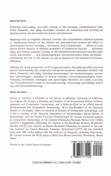 This book contains two personal reminiscences of historical importance to research on stress and infectious disease. It deals with perspectives on immunity, aging, and disease and the prospects for immunorestoration in the treatment of immunodeficiency arising from aging and stress.