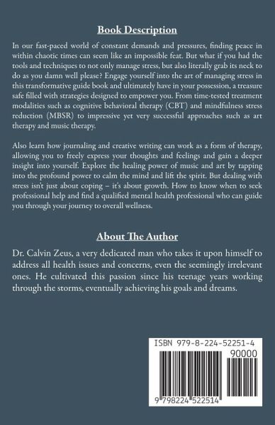 In our fast-paced world of constant demands and pressures, finding peace in within chaotic times can seem like an impossible feat. But what if you had the tools and techniques to not only manage stress, but also literally grab its neck to do as you damn well please? Introduction Engage yourself into the art of managing stress in this transformative guide book and ultimately have in your possession, a treasure safe filled with strategies designed to empower you. From time-tested treatment modalities such as cognitive behavioral therapy (CBT) and mindfulness stress reduction (MBSR) to impressive yet very successful approaches such as art therapy and music therapy. Also learn how journaling and creative writing can work as a form of therapy, allowing you to freely express your thoughts and feelings and gain a deeper insight into yourself. Explore the healing power of music and art by tapping into the profound power to calm the mind and lift the spirit. But dealing with stress isn't just about coping - it's about growth. How to know when to seek professional help and find a qualified mental health professional who can guide you through your journey to overall wellness.