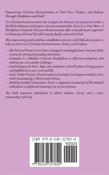 Empowering Christian Businesswomen to Find Peace, Purpose, and Balance Through Mindfulness and Faith" Imagine a life where peace and purpose replace the constant buzz of stress and overwhelm-a reality that can seem out of reach for Christian businesswomen navigating the demands of a fast-paced world. Imagine embracing a life filled with peace, purpose, and balance that aligns with your beliefs. What could that mean for you? "Stress Less, Pray More: A Mindfulness Guide for Christian Businesswomen" offers a transformative approach to navigating the demands of work and life while staying deeply connected to God. This empowering guide combines mindfulness practices with biblical principles to help you thrive as a Christian businesswoman. Inside, you'll explore:The Power of Prayer: Learn how to integrate meaningful prayer into your daily routine for spiritual grounding and clarity. Gratitude as a Mindset: Cultivate thankfulness to shift your perspective and embrace joy, even amidst challenges. Goal-Setting with God: Align your ambitions with His plan to bring purpose and fulfillment to your work and life. Grace Under Pressure: Discover practical strategies to navigate workplace stress while maintaining a Christ-centered focus. Building Faithful Connections: Foster a supportive community of like-minded individuals to uplift and encourage you on your journey. This book provides practical tools and spiritual insights to reduce stress, pray more, and lead with purpose and confidence. It includes daily reflection exercises, scripture, and examples of successful Christian businesswomen. It empowers individuals to achieve balance, clarity, and a closer relationship with God.