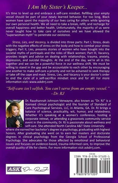 I Am My Sister’s Keeper... It’s time to level up and embrace a self-care mindset. Refilling your empty vessel should be part of your newly learned behavior. For too long, Black women have spent the majority of our lives caring for others while ignoring our own personal health. We all need to take a break, refill, and recharge for overall happiness and better health. Unfortunately, the majority of us were never taught how to take care of ourselves and we have allowed the "superwoman myth" to penetrate our existence. Stress, Lies, and Vacancy, is divided into three parts: Part I, Stress, deals with the negative effects of stress on the body and how to combat your stress triggers; Part II, Lies, presents stories of women who have bought into the societal myths of portrayals and the roles of Black women; Part III, Vacancy, provides insight and advice on dealing with relationships, trauma, anxiety, depression, and suicidal thoughts. At the end of the day, we’re all in this together and we can be a powerful force in our wellness shift. We must be willing to stand in the gap and be accountable to each other by encouraging one another to make self-care a priority and not be ashamed to seek therapy or take off the cape and mask. Stress, Lies, and Vacancy is your doctor’s order to end the cycle of a self-sacrifice mindset once and for all! "Self-care isn’t selfish. You can’t serve from an empty vessel." Dr. RJ