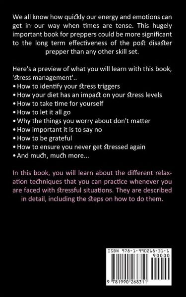 We all know how quickly our energy and emotions can get in our way when times are tense. This hugely important book for preppers could be more significant to the long term effectiveness of the post disaster prepper than any other skill set. Here's a preview of what you will learn with this book, 'stress management'.. ¿ How to identify your stress triggers ¿ How your diet has an impact on your stress levels ¿ How to take time for yourself ¿ How to let it all go ¿ Why the things you worry about don't matter ¿ How important it is to say no ¿ How to be grateful ¿ How to ensure you never get stressed again ¿ And much, much more... In this book, you will learn about the different relaxation techniques that you can practice whenever you are faced with stressful situations. They are described in detail, including the steps on how to do them.
