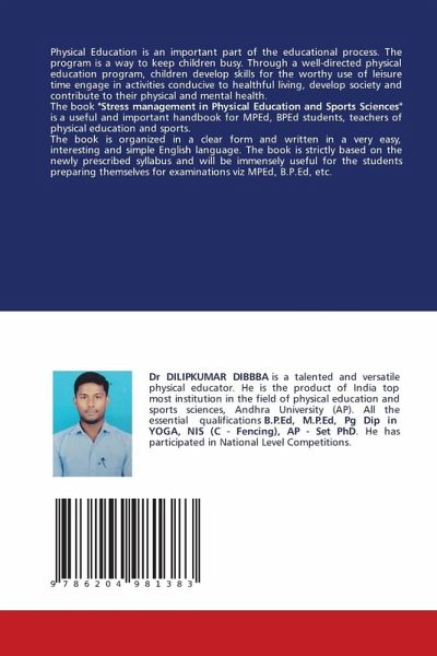 Physical Education is an important part of the educational process. The program is a way to keep children busy. Through a well-directed physical education program, children develop skills for the worthy use of leisure time engage in activities conducive to healthful living, develop society and contribute to their physical and mental health.The book "Stress management in Physical Education and Sports Sciences" is a useful and important handbook for MPEd, BPEd students, teachers of physical education and sports. The book is organized in a clear form and written in a very easy, interesting and simple English language. The book is strictly based on the newly prescribed syllabus and will be immensely useful for the students preparing themselves for examinations viz MPEd, B.P.Ed, etc.
