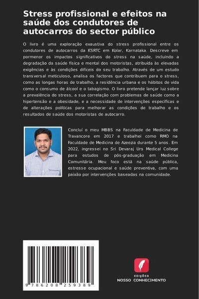 O livro é uma exploração exaustiva do stress profissional entre os condutores de autocarros da KSRTC em Kolar, Karnataka. Descreve em pormenor os impactos significativos do stress na saúde, incluindo a degradação da saúde física e mental dos motoristas, atribuída às elevadas exigências e às condições difíceis do seu trabalho. Através de um estudo transversal meticuloso, analisa os factores que contribuem para o stress, como as longas horas de trabalho, a residência urbana e os hábitos de vida como o consumo de álcool e o tabagismo. O livro pretende lançar luz sobre a prevalência do stress, a sua correlação com problemas de saúde como a hipertensão e a obesidade, e a necessidade de intervenções específicas e de alterações políticas para melhorar as condições de trabalho e os resultados de saúde dos motoristas de autocarro.