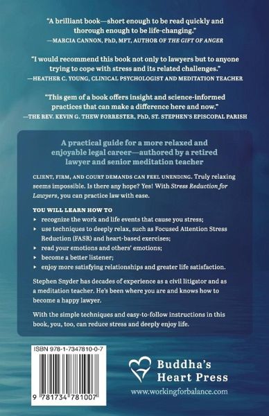 A practical guide for a more relaxed and enjoyable legal career-authored by a retired lawyer and senior meditation teacher Client, firm, and court demands can feel unending. Truly relaxing seems impossible. Is there any hope? Yes! With Stress Reduction for Lawyers, Law Students, and Legal Professionals, you can practice law with ease. You will learn how to:Recognize the work and life events that cause you stress Use techniques to deeply relax, such as Focused Attention Stress Reduction (FASR) and heart-based exercises Read your emotions and others' emotions Become a better listener Enjoy more satisfying relationships and greater life satisfaction Stephen Snyder has decades of experience as a civil litigator and as a meditation teacher. He's been where you are and knows how to become a happy lawyer. With the simple techniques and easy-to-follow instructions in this book, you, too, can reduce stress and deeply enjoy life.