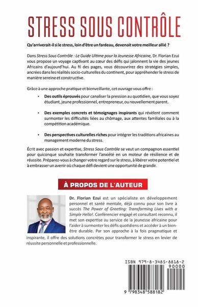 Stress Sous Contrôle: Le Guide Ultime pour la Jeunesse Africaine - Transformez votre stress en force et reprenez le contrôle de votre bien-être ! Êtes-vous un jeune Africain ambitieux, submergé par le stress des études, les attentes familiales et les incertitudes de l'avenir ? Ce livre est spécialement conçu pour vous. "Stress Sous Contrôle" vous offre des solutions concrètes et adaptées à votre réalité pour transformer le stress en énergie positive. Pourquoi ce guide se distingue: Conçu pour les jeunes Africains confrontés à des défis uniques, qu'il s'agisse de pression académique, professionnelle ou sociale. Solutions spécifiques face aux difficultés liées aux attentes culturelles et familiales, aux déceptions amoureuses, au chômage ou à la quête d'identité. Méthodes éprouvées basées sur des techniques scientifiquement validées, enrichies de témoignages inspirants et d'exercices pratiques. Ce que vous découvrirez dans ce livre: Des stratégies pour réduire l'anxiété, améliorer la concentration et prévenir l'épuisement mental. Des techniques spécifiques pour différents contextes: étudiants, jeunes professionnels, entrepreneurs, parents et même pour gérer le stress à l'ère de l'intelligence artificielle. Des témoignages réels et des études de cas illustrant comment transformer des périodes difficiles en opportunités de croissance personnelle. Des outils pratiques et des exercices faciles à intégrer dans votre quotidien pour retrouver sérénité et équilibre. Prenez le contrôle de votre vie dès aujourd'hui: Ce guide vous offre des outils concrets et une approche pragmatique, sans conseils vagues ni méthodes compliquées. Que vous cherchiez à surmonter une rupture, à faire face à des défis académiques ou à gérer l'incertitude professionnelle, ce livre est votre compagnon idéal pour construire une vie plus équilibrée et résiliente. Mots-clés SEO: Gestion du stress, bien-être mental, résilience, jeunesse africaine, développement personnel, anxiété, surmonter le stress, motivation, confiance en soi, épanouissement personnel, techniques anti-stress, intelligence artificielle et stress, guide pratique. Commandez dès maintenant "Stress Sous Contrôle: Le Guide Ultime pour la Jeunesse Africaine" et commencez votre transformation vers une vie plus sereine et épanouie.