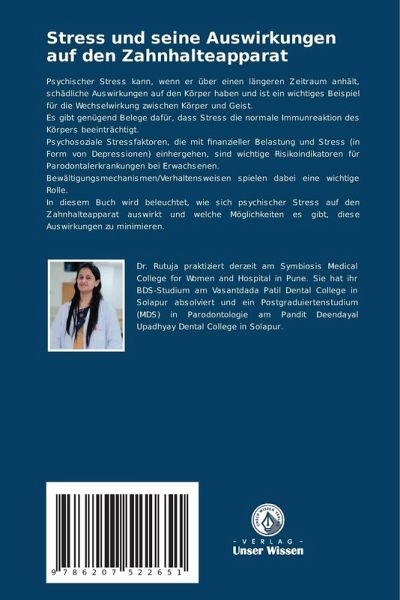 Psychischer Stress kann, wenn er über einen längeren Zeitraum anhält, schädliche Auswirkungen auf den Körper haben und ist ein wichtiges Beispiel für die Wechselwirkung zwischen Körper und Geist.Es gibt genügend Belege dafür, dass Stress die normale Immunreaktion des Körpers beeinträchtigt.Psychosoziale Stressfaktoren, die mit finanzieller Belastung und Stress (in Form von Depressionen) einhergehen, sind wichtige Risikoindikatoren für Parodontalerkrankungen bei Erwachsenen.Bewältigungsmechanismen/Verhaltensweisen spielen dabei eine wichtige Rolle.In diesem Buch wird beleuchtet, wie sich psychischer Stress auf den Zahnhalteapparat auswirkt und welche Möglichkeiten es gibt, diese Auswirkungen zu minimieren.