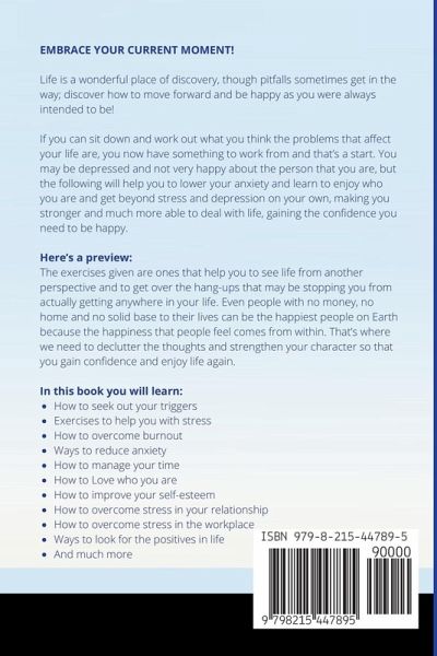 EMBRACE YOUR CURRENT MOMENT! Life is a wonderful place of discovery, though pitfalls sometimes get in the way; discover how to move forward and be happy as you were always intended to be! If you can sit down and work out what you think the problems that affect your life are, you now have something to work from and that's a start. You may be depressed and not very happy about the person that you are, but the following will help you to lower your anxiety and learn to enjoy who you are and get beyond stress and depression on your own, making you stronger and much more able to deal with life, gaining the confidence you need to be happy. In this book you will learn:How to seek out your triggers Exercises to help you with stress How to overcome burnout Ways to reduce anxiety How to manage your time How to love who you are How to improve your self-esteem Ways to look for the positives in life How to overcome stress in the workplace How to overcome stress in your relationship And much more