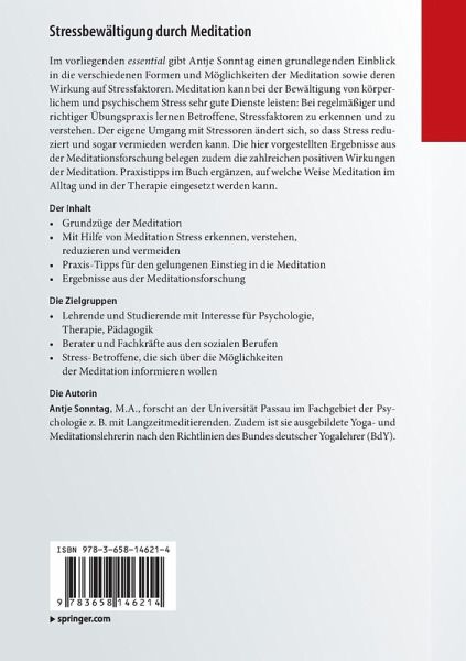 Im vorliegenden essential gibt Antje Sonntag einen grundlegenden Einblick in die verschiedenen Formen und Möglichkeiten der Meditation sowie deren Wirkung auf Stressfaktoren. Meditation kann bei der Bewältigung von körperlichem und psychischem Stress sehr gute Dienste leisten: Bei regelmäßiger und richtiger Übungspraxis lernen Betroffene, Stressfaktoren zu erkennen und zu verstehen. Der eigene Umgang mit Stressoren ändert sich, so dass Stress reduziert und sogar vermieden werden kann. Die hier vorgestellten Ergebnisse aus der Meditationsforschung belegen zudem die zahlreichen positiven Wirkungen der Meditation. Praxistipps im Buch ergänzen, auf welche Weise Meditation im Alltag und in der Therapie eingesetzt werden kann.