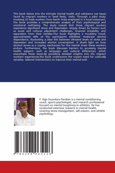 This book delves into the intricate mental health and substance use issues faced by migrant workers in Tamil Nadu, India. Through a pilot study involving 32 male workers from North India employed in a local restaurant, the book provides a comprehensive analysis of their psychological and emotional well-being. The study reveals that these migrant workers experience significant stress and depression, largely driven by factors such as social and cultural adjustment challenges, financial instability, and separation from their families.The book highlights a troubling trend: approximately 44% of the participants exhibited moderate alcohol dependence, illustrating a clear link between elevated levels of stress and depression and increased alcohol consumption. It sheds light on how alcohol serves as a coping mechanism for the mental strain these workers endure. Furthermore, the book discusses barriers to accessing mental health support, such as language and cultural differences, which exacerbate these issues.By providing detailed insights into the migrant workers' experiences,the book underscores the urgent need for culturally sensitive, tailored interventions to improve their mental well.