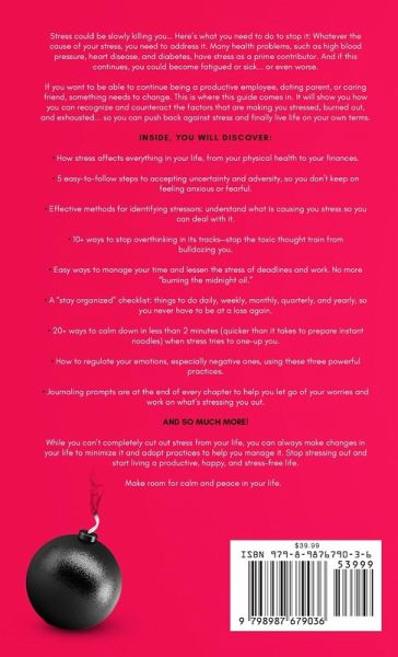 Stress could be slowly killing you... Here's what you need to do to stop it: Do you get irritated and angry by the smallest of things? Do you feel overburdened by work and relationships? Are you continuously overthinking and worrying about anything and everything? If your answer to any of the questions above is yes, you are stressed and need help. You might be running yourself ragged at work, trying to do everything. You may be feeling under pressure from all the responsibilities you have to fulfill. Or you could simply be too overstretched from having to accomplish an endless to-do list, both at home and at work. Whatever the cause of your stress, you need to address it. Many health problems, such as high blood pressure, heart disease, and diabetes, have stress as a prime contributor. And if this continues, you could become fatigued, sick, etc., or even worse. If you want to be able to continue being a productive employee, doting parent, or caring friend, something needs to change. But it can be hard to change when you've become used to living with stress for so long. This is where this guide comes in. It will show you how to recognize and counteract the factors that make you stressed, burned out, and exhausted, so you can push back against stress and finally live life on your own terms. Here is just a small fraction of what you will discover in this guide: ¿ How stress affects everything in your life, from your physical health to your finances. ¿ 5 easy-to-follow steps to accepting uncertainty and adversity so you don't keep on feeling anxious or fearful. ¿ Effective methods for identifying stressors-understand what is causing you stress so you can take care of it. ¿ 10+ ways to stop overthinking in its tracks-stop the toxic thought train from bulldozing you. ¿ Easy ways to manage your time and lessen the stress of deadlines and work. No more "burning the midnight oil." ¿ A "stay organized" checklist: things to do daily, weekly, monthly, quarterly, and yearly, so you never have to be at a loss again. ¿ 20+ ways to calm down in less than 2 minutes (quicker than it takes to prepare instant noodles) when stress tries to one-up you. ¿ How to regulate your emotions, especially negative ones, using these 3 powerful practices. ¿ Journaling prompts are at the end of every chapter to help you let go of your worries and work on what's stressing you out. And so much more! We accumulate a lot of stress without even realizing it. But to overcome it, we need to be aware of how much it's affecting us and be proactive about what we can do. While you can't completely cut out stress from your life, you can always make changes in your life to minimize it and adopt practices to help you manage it. Stop stressing out and start living a productive, happy, and stress-free life.