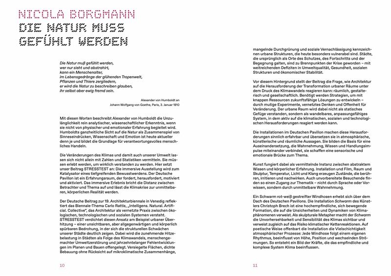 The catalogue for the German Pavilion expands the exhibition with essays by Luisa Amann, Maria Aubock, bauchplan ).(, Silvia C. Benedito, Carsten Dierkes, Almut Grüntuch-Ernst, Andreas Kipar, Klaus K. Loenhart, Bernhard Maaz, Andreas Matzarakis, Burkert Pieske, and Boris Schroder-Esselbach.