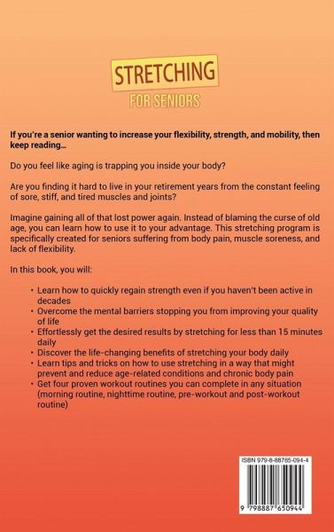 If you're a senior wanting to increase your flexibility, strength, and mobility, then keep reading... Do you feel like aging is trapping you inside your body? Are you finding it hard to live in your retirement years from the constant feeling of sore, stiff, and tired muscles and joints? Imagine gaining all of that lost power again. Instead of blaming the curse of old age, you can learn how to use it to your advantage. This stretching program is specifically created for seniors suffering from body pain, muscle soreness, and lack of flexibility. Learn how to quickly regain strength even if you haven't been active in decades Overcome the mental barriers stopping you from improving your quality of life Effortlessly get the desired results by stretching for less than 15 minutes daily Discover the life-changing benefits of stretching your body daily Learn tips and tricks on how to use stretching in a way that might prevent and reduce age-related conditions and chronic body pain Get four proven workout routines you can complete in any situation (morning routine, nighttime routine, pre-workout and post-workout routine) Scroll up and click the "add to cart" button to discover what you need to know about stretching for seniors!