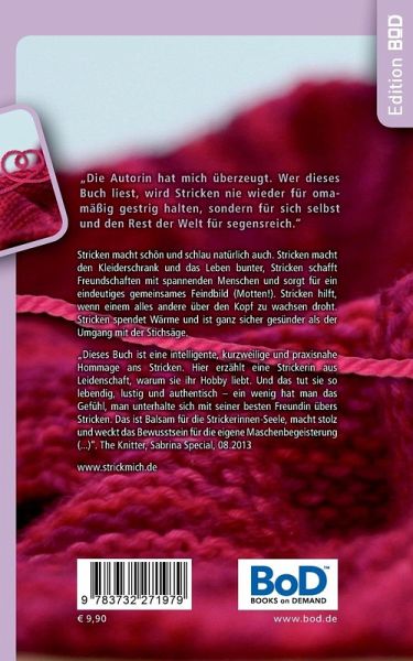 Stricken macht schön, und schlau natürlich auch. Stricken macht den Kleiderschrank und das Leben bunter, Stricken schafft Freundschaften mit spannenden Menschen und sorgt für ein eindeutiges gemeinsames Feindbild (Motten!). Stricken hilft, wenn einem alles andere über den Kopf zu wachsen droht. Stricken spendet Wärme und ist ganz sicher gesünder als der Umgang mit der Stichsäge. Lauter gute Gründe, sofort damit anzufangen!"Die Autorin hat mich überzeugt. Wer dieses Buch liest, wird stricken nie wieder für omamäßig gestrig halten, sondern für sich selbst und den Rest der Welt für segensreich." Vito von Eichborn, 12.2013 Dieses Buch ist eine intelligente, kurzweilige und praxisnahe Hommage ans Stricken. Hier erzählt eine Strickerin aus Leidenschaft, warum sie ihr Hobby liebt. Und das tut sie so lebendig, lustig und authentisch - ein wenig hat man das Gefühl, man unterhalte sich mit seiner besten Freundin übers Stricken. Das ist Balsam für die Strickerinnen-Seele, macht stolz und weckt das Bewusstsein für die eigene Maschenbegeisterung.(...) The Knitter, Sabrina Special, 08.2013www.strickmich.de