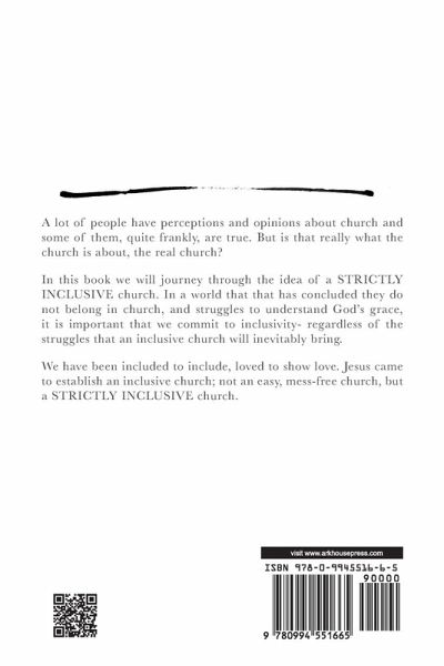 A lot of people have perceptions and opinions about church and some of them, quite frankly, are true. But is that really what the church is about, the real church? In this book we will journey through the idea of a Strictly Inclusive church. In a world that that has concluded they do not belong in church, and struggles to understand God's grace, it is important that we commit to inclusivity- regardless of the struggles that an inclusive church will inevitably bring. We have been included to include, loved to show love. Jesus came to establish an inclusive church; not an easy, mess-free church, but a Strictly Inclusive church.