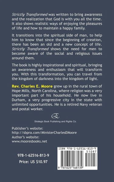 Strictly Transformed was written to bring awareness and the realization that God is with you all the time. It also shows realistic ways of enjoying the pleasures of life and how to maintain a happy family. It transitions into the spiritual side of man, to help him to know that since the beginning of creation, there has been an old and a new concept of life. Strictly Transformed shows the need for men to become aware of the social and religious issues around them. The book is highly inspirational and spiritual, bringing an awareness and enthusiasm that will transform you. With this transformation, you can travel from the kingdom of darkness into the kingdom of light. Rev. Charles E. Moore grew up in the rural town of Hope Mills, North Carolina, where religion was a very important part of his household. He now live in Durham, a very progressive city in the state with unlimited opportunities. He is a retired Navy veteran and postal worker. Publisher's website: http://sbpra.com/MinisterCharlesEMoore