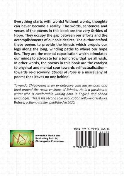 Everything starts with words! Without words, thoughts can never become a reality. The words, sentences and verses of the poems in this book are the very Strides of Hope. They occupy the gap between our efforts and the accomplishments of our sole desires. The author crafted these poems to provide the kinesis which propels our legs along the long, winding paths to where our hope lies. They are the mental capacitation which stimulates our minds to advocate for a tomorrow that we all wish. In other words, the poems in this book are the catalyst to physical and mental spur towards self-actualisation - towards re-discovery! Strides of Hope is a miscellany of poems that leaves no one behind. Tawanda Chigavazira is an ex-Detective cum Lawyer born and bred around the rustic environs of Zvimba. He is a passionate writer who is comfortable writing both in English and Shona languages. This is his second solo publication following Watsika Rufuse, a Shona thriller, published in 2020.