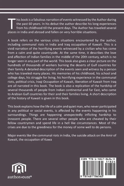 This book is a fabulous narration of events witnessed by the Author during the past 60 years. In his debut the author describe his long experiences from his childhood till the present days. The Author has traveled several places in India and abroad and fallen on very horrible situations. A book refers on the various crisis situations encountered by the author, including communal riots in India and Iraq occupation of Kuwait. This is a vivid narration of the horrifying events witnessed by a civilian who has come from a calm and quite countryside. At the same time, it describes the love and affection of Indian families in the middle of the 20th century, which is no longer seen in any part of the world. This book also gives a clear picture on the hundreds of thousands of workers burning the deserts of Gulf countries for their family A detailed description of the events seen and witness by a person who has traveled many places. His memories of his childhood, his school and college days, his struggle for living, his horrifying experience in the communal riots, political crisis, Iraqi Occupation of Kuwait, liberation of Kuwait from Iraq are all narrated in this book. The book is also a replication of the hardship of several thousands of people from Indian continental and Far East, who came to Arabian Gulf countries for their and their families living. A short description of the history of Kuwait is given in this book. This book explains how the life of a calm and quiet man, who never participated in any political or social events, is affected by the events happening in his surroundings. Things are happening unexpectedly inflicting hardship to innocent people. There are several other people who are cheated by their fellow countrymen and spend life in a hell like circumstances. Most of the crises are due to the greediness for the money of some well to do persons. Major events like the communal riots in India, the suicide attack on the Amir of Kuwait, the occupation of Kuwa