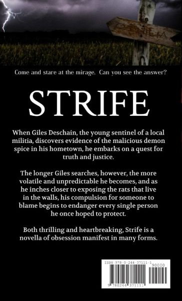 When Giles Deschain, the young sentinel of a local militia, discovers evidence of the malicious demon spice in his hometown, he embarks on a quest for truth and justice. The longer Giles searches, however, the more volatile and unpredictable he becomes, and as he inches closer to exposing the rats that live in the walls, his compulsion for someone to blame begins to endanger every single person he once hoped to protect. Both thrilling and heartbreaking, Strife is a novella of obsession manifest in many forms.