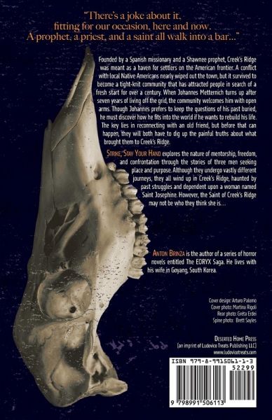 Under the critical eyes of the Saint of Creek's Ridge, three men struggle for purpose in a world built upon their own misdeeds. Johannes Metternich has been living off the grid for so long that his friends assumed him dead. When he turns up in Creek's Ridge, he cannot answer questions about his past-or perhaps he is just unwilling. The town welcomes him with open arms anyway, affording him plenty of distractions from the nightmares that torment his sleep. To move on with his life, he must reconnect with an old friend. But before that can happen, they will both have to dig up the painful truths about what brought them to Creek's Ridge. While the residents attempt to help Johannes find his footing, they are also caught up in the town's mysterious history. Founded as a place for people to heal from the hardships of the frontier, Creek's Ridge has long been a haven for those on the fringes of society. The town has attracted people for over a century with its strong sense of community and peaceful isolation. Its noble beginnings still linger, but so do traces of its fraught history, including the infamous Native American raids that almost decimated the settlement and the misunderstood Saint who saved it. Strike, Stay Your Hand explores the nature of mentorship, freedom, and confrontation through the interwoven stories of Johannes and the founders-a rogue missionary and a notorious Shawnee prophet. Though the three men undergo vastly different journeys, they all wind up in Creek's Ridge, haunted by their pasts and dependent upon a woman named Saint Josephine. However, the Saint of Creek's Ridge may not be who they think she is...