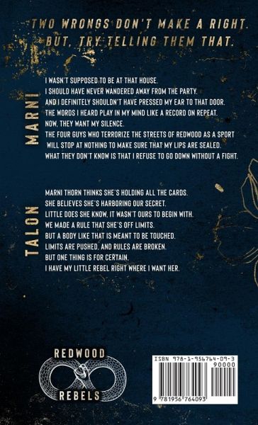 Two wrongs don't make a right. But, try telling them that. Marni I wasn't supposed to be at that house. I should have never wandered away from the party. And I definitely shouldn't have pressed my ear to that door. The words I heard play in my mind like a record on repeat. Now, they want my silence. The four guys who terrorize the streets of Redwood as a sport will stop at nothing to make sure that my lips are sealed. What they don't know is that I refuse to go down without a fight. Talon Marni Thorn thinks she's holding all the cards. She believes she's harboring our secret. Little does she know, it wasn't ours to begin with. We made a rule that she's off limits. But a body like that is meant to be touched. Limits are pushed, and rules are broken. But one thing is for certain, I have my little rebel right where I want her.