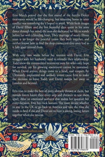 Erin March prayed that the first round of the Fertilis Defect treatments would be life-changing, but returning home in utter conflict was something she'd hoped to avoid. While fresh images of David Elliott and the five beautiful days spent in his arms dance through her mind, the man she dedicated her life to stands before her with a bleeding heart. Their marriage of nearly fifteen years is no longer the peaceful union they built together, and neither knows how to find the deep connection they once had as it falls apart around them. With only two weeks before her reunion with David, Erin struggles with her husband's need to rekindle their relationship. Todd knew the controversial treatments were his wife's only hope for survival, yet his growing resentment cannot be contained. When David arrives, things come to a head, and tempers fly. Ultimately, unplanned and unlikely events cause Erin to make the leave decision to leave Todd, and David sweeps her away to London and beyond. Erin tries to make the best of every obstacle thrown at them, but outside forces haunt their every step and threaten to tear them apart. After an emotional outburst that makes her question her every decision, Erin hits rock bottom. She must decide whether to stay in the UK or go back to America and take the time she needs to heal if she and David are to have a strong, loving future together when she returns.
