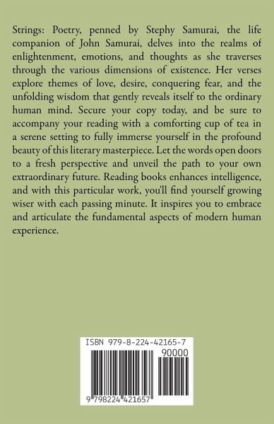 Strings: Poetry, penned by Stephy Samurai, the life companion of John Samurai, delves into the realms of enlightenment, emotions, and thoughts as she traverses through the various dimensions of existence. Her verses explore themes of love, desire, conquering fear, and the unfolding wisdom that gently reveals itself to the ordinary human mind. Secure your copy today, and be sure to accompany your reading with a comforting cup of tea in a serene setting to fully immerse yourself in the profound beauty of this literary masterpiece. Let the words open doors to a fresh perspective and unveil the path to your own extraordinary future. Reading books enhances intelligence, and with this particular work, you'll find yourself growing wiser with each passing minute. It inspires you to embrace and articulate the fundamental aspects of modern human experience.