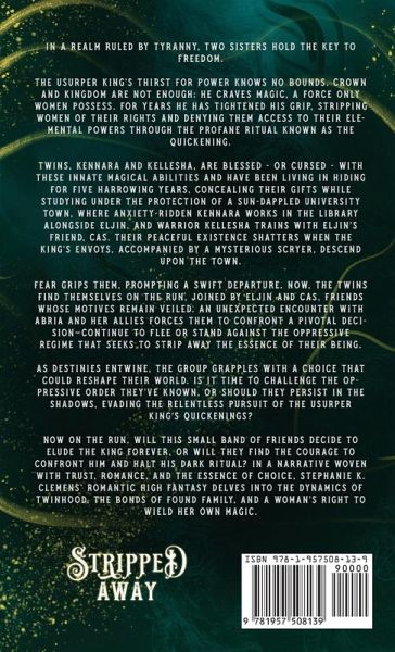 In a realm ruled by tyranny, two sisters hold the key to freedom. The usurper king's thirst for power knows no bounds. Crown and kingdom are not enough; he craves magic, a force only women possess. For years he has tightened his grip, stripping women of their rights and denying them access to their elemental powers through the profane ritual known as the Quickening. Twins, Kennara and Kellesha, are blessed - or cursed - with these innate magical abilities and have been living in hiding for five harrowing years, concealing their gifts while studying under the protection of a sun-dappled university town, where anxiety-ridden Kennara works in the library alongside Eljin, and warrior Kellesha trains with Eljin's friend, Cas. Their peaceful existence shatters when the king's envoys, accompanied by a mysterious scryer, descend upon the town. Fear grips them, prompting a swift departure. Now, the twins find themselves on the run, joined by Eljin and Cas, friends whose motives remain veiled. An unexpected encounter with Abria and her allies forces them to confront a pivotal decision-continue to flee or stand against the oppressive regime that seeks to strip away the essence of their being. As destinies entwine, the group grapples with a choice that could reshape their world. Is it time to challenge the oppressive order they've known, or should they persist in the shadows, evading the relentless pursuit of the usurper king's Quickenings? Now on the run, will this small band of friends decide to elude the king forever, or will they find the courage to confront him and halt his dark ritual? In a narrative woven with trust, romance, and the essence of choice, Stephanie K. Clemens' romantic high fantasy delves into the dynamics of twinhood, the bonds of found family, and a woman's right to wield her own magic.