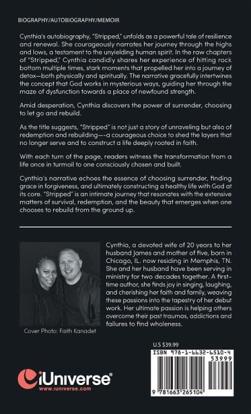 Cynthia's autobiography, "Stripped," unfolds as a powerful tale of resilience and renewal. She courageously narrates her journey through the highs and lows, a testament to the unyielding human spirit. In the raw chapters of "Stripped," Cynthia candidly shares her experience of hitting rock bottom multiple times, stark moments that propelled her into a journey of detox-both physically and spiritually. The narrative gracefully intertwines the concept that God works in mysterious ways, guiding her through the maze of dysfunction towards a place of newfound strength. Amid desperation, Cynthia discovers the power of surrender, choosing to let go and rebuild. As the title suggests, "Stripped" is not just a story of unraveling but also of redemption and rebuilding--a courageous choice to shed the layers that no longer serve and to construct a life deeply rooted in faith. With each turn of the page, readers witness the transformation from a life once in turmoil to one consciously chosen and built. Cynthia's narrative echoes the essence of choosing surrender, finding grace in forgiveness, and ultimately constructing a healthy life with God at its core. "Stripped" is an intimate journey that resonates with the extensive matters of survival, redemption, and the beauty that emerges when one chooses to rebuild from the ground up.