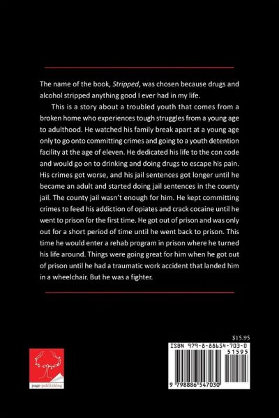 The name of the book, Stripped, was chosen because drugs and alcohol stripped anything good I ever had in my life. This is a story about a troubled youth that comes from a broken home who experiences tough struggles from a young age to adulthood. He watched his family break apart at a young age only to go onto committing crimes and going to a youth detention facility at the age of eleven. He dedicated his life to the con code and would go on to drinking and doing drugs to escape his pain. His crimes got worse, and his jail sentences got longer until he became an adult and started doing jail sentences in the county jail. The county jail wasn't enough for him. He kept committing crimes to feed his addiction of opiates and crack cocaine until he went to prison for the first time. He got out of prison and was only out for a short period of time until he went back to prison. This time he would enter a rehab program in prison where he turned his life around. Things were going great for him when he got out of prison until he had a traumatic work accident that landed him in a wheelchair. But he was a fighter.
