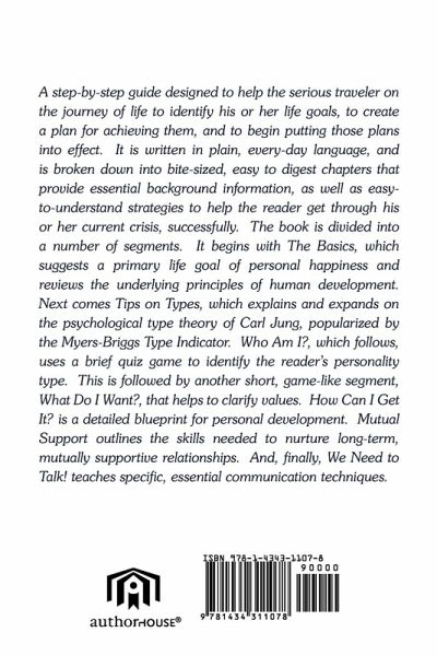 A step-by-step guide designed to help the serious traveler on the journey of life to identify his or her life goals, to create a plan for achieving them, and to begin putting those plans into effect. It is written in plain, every-day language, and is broken down into bite-sized, easy to digest chapters that provide essential background information, as well as easy-to-understand strategies to help the reader get through his or her current crisis, successfully. The book is divided into a number of segments. It begins with The Basics, which suggests a primary life goal of personal happiness and reviews the underlying principles of human development. Next comes Tips on Types, which explains and expands on the psychological type theory of Carl Jung, popularized by the Myers-Briggs Type Indicator. Who Am I?, which follows, uses a brief quiz game to identify the reader's personality type. This is followed by another short, game-like segment, What Do I Want?, that helps to clarify values. How Can I Get It? is a detailed blueprint for personal development. Mutual Support outlines the skills needed to nurture long-term, mutually supportive relationships. And, finally, We Need to Talk! teaches specific, essential communication techniques.