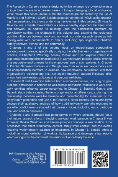 A volume in Research in Careers Series Editors: Sherry E. Sullivan, Bowling Green State University and S. Gayle Baugh, University of West Florida The Research in Careers series is designed in five volumes to provide scholars a unique forum to examine careers issues in today's changing, global workplace. What makes this series unique is that the volumes are connected by the use of Mainiero and Sullivan's (2006) Kaleidoscope Career Model (KCM) as the organizing framework and the theme underlying the volumes. In this volume, Striving for Balance, we consider how individuals seek a healthy alignment between work and nonwork. In addition to building upon the established literature on work/family conflict, the chapters in this volume also examine the reciprocal positive influences between work and nonwork, considering such issues as balancing work with commitments to others, including spouse/partner, children, elderly relatives, friends, and the community. Chapters 1 and 2 of this volume focus on macröissues surrounding work/nonwork balance, specifically studying the effectiveness of organizational policies. In Chapter 1, Westring, Kossek, Pichler and Ryan explore if there is a gap between an organization's adoption of work/nonwork policies and its offering of a supportive environment for the employees' use of such policies. In Chapter 2, Purohit, Simmers, Sullivan and Baugh draw from social exchange theory and the compensation literature to examine how employees' satisfaction with their organization's discretionary (i.e., not legally required) support initiatives influences their work¿related attitudes and personal well¿being. Chapters 3 and 4 examine balance from a micro perspective, focusing on generational differences in balance as well as how individuals' reactions to work¿nonwork conflicts influence career outcomes. In Chapter 3, Stawiski, Gentry and Baranik study balance using the lens of generational differences, exploring the relationship between work¿life balance and promotability for members of the Baby Boom generation and Gen X. In Chapter 4, Boyd, Keeney, Sinha and Ryan discuss their qualitative analysis of how 1,359 university alumni's reactions to work¿life conflict events shaped their career choices, including entry, participation, and attrition decisions. Their approach offers a different lens to examine work¿life conflict. Chapters 5 and 6 provide two perspectives on where scholars should focus their future research efforts in studying work/nonwork balance. In Chapter 5, van Emmerik, Bakker, Westman and Peeters provide a conceptual examination of the processes that affect work¿family conflict, family¿work conflict, and the overall resulting work/nonwork balance or imbalance. In Chapter 6, Bataille offers a multi¿dimensional definition of work¿family balance and develops a framework, which recognizes the dominant dimensions of workfamily balance.