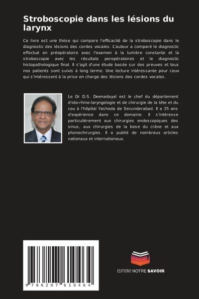 Ce livre est une thèse qui compare l'efficacité de la stroboscopie dans le diagnostic des lésions des cordes vocales. L'auteur a comparé le diagnostic effectué en préopératoire avec l'examen à la lumière constante et la stroboscopie avec les résultats peropératoires et le diagnostic histopathologique final. Il s'agit d'une étude basée sur des preuves et tous nos patients sont suivis à long terme. Une lecture intéressante pour ceux qui s'intéressent à la prise en charge des lésions des cordes vocales.