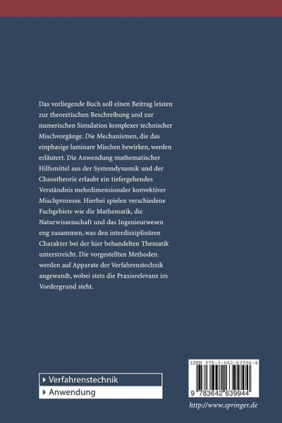 Das vorliegende Buch soll einen Beitrag leisten zur theoretischen Beschreibung und zur numerischen Simulation komplexer laminarer Mischvorgänge. Die Mechanismen, die das laminare Mischen bewirken, werden erläutert. Die Anwendung mathematischer Hilfsmittel aus der Systemdynamik und der Chaostheorie erlaubt ein tiefergehendes Verständnis praxisrelevanter Mischvorgänge. Hierbei spielen verschiedene Fachgebiete wie die Mathematik, die Naturwissenschaft und das Ingenieurwesen eng zusammen, was den interdisziplinären Charakter bei der hier behandelten Thematik unterstreicht. Die vorgestellten Methoden werden auf Apparate der Verfahrenstechnik angewandt, wobei stets die Praxisrelevanz im Vordergrund steht.