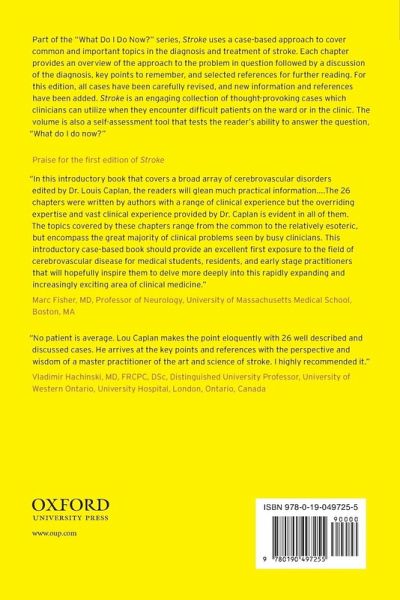 Part of the "What Do I Do Now?" series, Stroke uses a case-based approach to cover common and important topics in the diagnosis and treatment of stroke. Each chapter provides an overview of the approach to the problem in question followed by a discussion of the diagnosis, key points to remember, and selected references for further reading. For this edition, all cases have been carefully revised, and new information and references have been added. Stroke is an engaging collection of thought-provoking cases which clinicians can utilize when they encounter difficult patients on the ward or in the clinic. The volume is also a self-assessment tool that tests the reader's ability to answer the question, "What do I do now?"