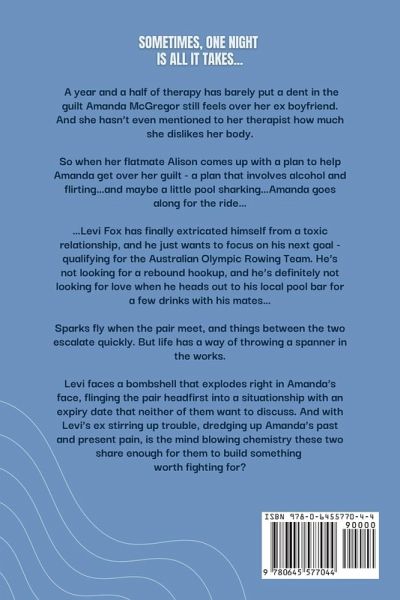 Sometimes, one night is all it takes... A year and a half of therapy has barely put a dent in the guilt Amanda McGregor still feels over her ex boyfriend. And she hasn't even mentioned to her therapist how much she dislikes her body. So when her flatmate Alison comes up with a plan to help Amanda get over her guilt - a plan that involves alcohol and flirting...and maybe a little pool sharking...Amanda goes along for the ride... ...Levi Fox has finally extricated himself from a toxic relationship, and he just wants to focus on his next goal - qualifying for the Australian Olympic Rowing Team. He's not looking for a rebound hookup, and he's definitely not looking for love when he heads out to his local pool bar for a few drinks with his mates... Sparks fly when the pair meet, and things between the two escalate quickly. But life has a way of throwing a spanner in the works. Levi faces a bombshell that explodes right in Amanda's face, flinging the pair headfirst into a situationship with an expiry date that neither of them want to discuss. And with Levi's ex stirring up trouble, dredging up Amanda's past and present pain, is the mind blowing chemistry these two share enough for them to build something worth fighting for?