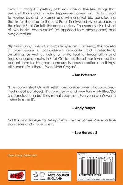 "What a drag it is getting old" was one of the few things that Belmont Thom and his wife Tuppence agreed on. With a nod to Sophocles and to Homer and with a great big genuflecting thanks-for-the-idea to the late Peter Tinniswood (who appears in the piece) Stroll On tells this couple's story. The narrative is a hybrid of two kinds: 'poem-prose' (as opposed to a prose poem) and magic-realism. 'By turns funny, brilliant, sharp, savage, and surprising, this novella in poem-prose is compulsively readable and intellectually sustaining, as well as being a terrific feat of imagination and linguistic legerdemain. In Stroll On James Russell has invented the perfect form for his good-humouredly caustic outlook on things. All human life is there. Even Alma Cogan'. - Ian Patterson 'I devoured Stroll On with relish (and a side order of quadrupley-fried sweet potatoes). It's very clever and very funny (Neither/Do orgasms last long but they remain popular). Everyone who's worth it should read it'. - Andy Mayer 'All this and his eye for telling details make James Russell a true story teller and a true poet'. - Lee Harwood