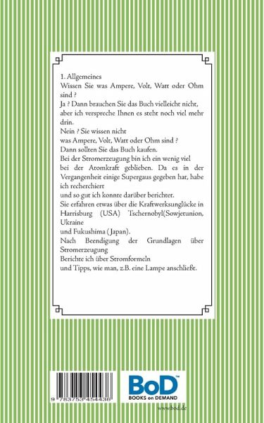 1. Allgemeines Wissen Sie was Ampere, Volt, Watt oder Ohm sind? Ja? Dann brauchen Sie das Buch vielleicht nicht, aber ich verspreche Ihnen es steht noch viel mehr drin. Nein? Sie wissen nicht was Ampere, Volt, Watt oder Ohm sind?Dann sollten Sie das Buch kaufen. Bei der Stromerzeugung bin ich ein wenig viel bei der Atomkraft geblieben. Da es in der Vergangenheit einige Supergaus gegeben hat, habe ich recherchiert und so gut ich konnte darüber berichtet.Sie erfahren etwas über die Kraftwerksunglücke in Harrisburg (USA) Tschernobyl Sowjetunion, Ukraine und Fukushima (Japan).Nach Beendigung der Grundlagen über Stromerzeugung berichte ich über Stromformeln und Tipps, wie man, z.B. eine Lampe anschließt.