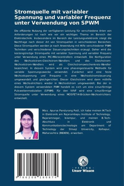 Die effiziente Nutzung der verfügbaren Leistung für verschiedene Arten von Anforderungen ist nach wie vor ein wichtiges Thema im Bereich der Elektrotechnik. Insbesondere im Bereich der Leistungselektronik steigt die Nachfrage nach dieser Art von Stromquellen in verschiedenen Bereichen. Diese Stromquellen werden je nach Anwendung mit Hilfe verschiedener PWM-Techniken und verschiedener Steuerungstechniken erzeugt. Daher wird die kostengünstige Stromquelle mit variabler Spannung und variabler Frequenz unter Verwendung eines PIC-Mikrocontrollers entwickelt. Die Konfiguration des Wechselstrom-Gleichstrom-Wandlers und des Gleichstrom-Wechselstrom-Wandlers wird als Gleichstromzwischenkreis-Wandler bezeichnet. In diesem System wird eine phasengesteuerte Methodik für variable Spannungszwecke verwendet. Zunächst wird eine feste Wechselspannung und Frequenz in eine Wechselstromsteuerung umgewandelt und gleichgerichtet. Dieser Gleichstrom wird dann mithilfe eines Wechselrichters wieder in Wechselstrom umgewandelt. Bei der in diesem System verwendeten PWM handelt es sich um eine sinusförmige Pulsweitenmodulation (SPWM). Für den VVVF wird eine sinusförmige Stromquelle unter Verwendung eines MOSFET-H-Brücken-Wechselrichters entwickelt.