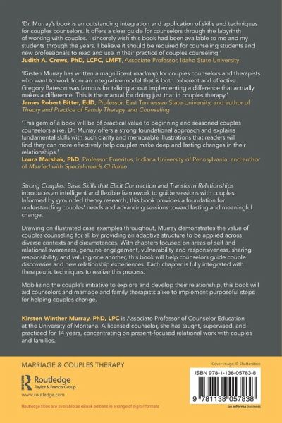 Strong Couples: Basic Skills that Elicit Connection and Transform Relationships introduces an intelligent and flexible framework to guide sessions with couples. Informed by grounded theory research, this book provides a foundation for understanding couples' needs and advancing sessions toward lasting and meaningful change. Drawing on illustrated case examples throughout, Murray demonstrates the value of couples counseling for all by providing an adaptive structure to be applied across diverse contexts and circumstances. With chapters focused on areas of self and relational awareness, genuine engagement, vulnerability and responsiveness, sharing responsibility, and valuing one another, this book will help counselors guide couple discoveries and new relationship experiences. Each chapter is fully integrated with therapeutic techniques to realize this process. Mobilizing the couple's initiative to explore and develop their relationship, this book will aid counselors and marriage and family therapists alike to implement purposeful steps for helping couples change.