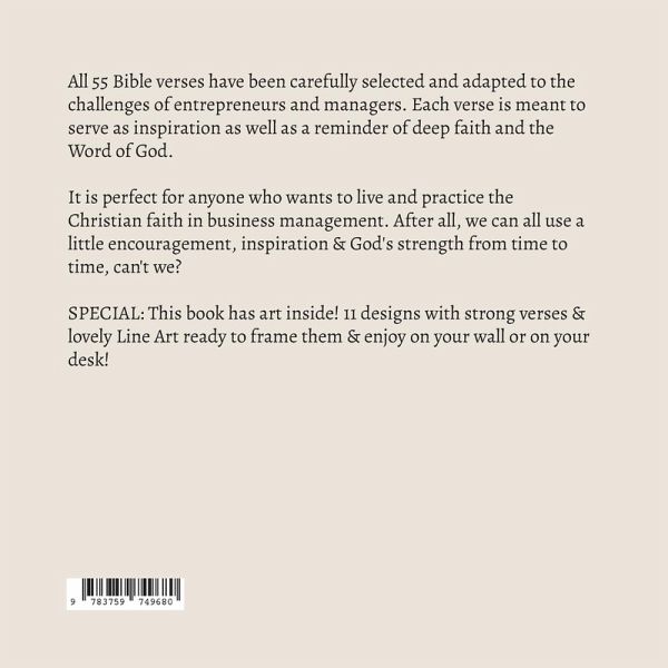 This lovingly designed book with 55 Bible verses for everyday life is perfect for Christian Entrepreneurs! Whether it's a birthday, anniversary or other occasion: this collection is also a thoughtful gift idea with Bible verses in book form. It is perfect for anyone who wants to live and practice the Christian faith in business management & leadership. After all, we can all use a little encouragement, inspiration & God's strength from time to time, can't we?All Bible verses have been carefully selected and adapted to the challenges of entrepreneurs and managers. Each verse is meant to serve as inspiration as well as a reminder of deep faith and the Word of God.This book has Art inside! 11 designs with strong quotations plus unique Line Art ready to frame them & enjoy on your wall or on your desk!Strong in Faith & Business: 55 Bible verses for Christian Entrepreneurs at a glace:- 55 Bible verses for everyday Leadership- Beautiful softcover book with a matt finish- perfect gift idea for Christian Leaders- in an attractive square format: 17 x 17 cm (6.7x6.7 inch)- 11 different Line Art graphics ready to frame!