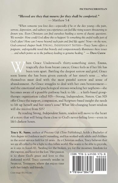 "Blessed are they that mourn: for they shall be comforted." -- Matthew 5:4 When someone you love dies-especially if he or she dies young-the pain, sorrow, depression, and sadness you experience can feel like rising waters threatening to drown you. Even Christians can find ourselves battling a storm of chaotic questions. We wonder: How could God allow this to happen? Is something this awful really part of God's plan? How can I move beyond such pain and find life again? Now-in the new, God-centered chapter book Strong, Independent Sisters-Tracy Sams offers a poignant, unforgettable novel that bravely and compassionately illuminates these issues … and which points us to the pathway leading to genuine healing. When Grace Underwood's thirty-something sister, Emma, tragically dies from breast cancer, Grace feels as if her life has been torn apart. Battling the deepest sorrow and grief, Grace soon learns she has been given custody of her sister's sons … who themselves must deal with the most painful sorrow and sense of abandonment. As Grace struggles to deal with her own bereavement-and the emotional and psychological stresses wracking her nephews-she becomes aware of a possible pathway back to life … a faith-based group-therapy organization called SIS-Strong, Independent, Sisters. Can SIS offer Grace the support, compassion, and Scripture-based insight she needs to lift up herself and her sister's sons? What life-changing heart-wisdom will she receive from SIS? By reading Strong, Independent Sisters, readers will move to the heart of a story that will bring them close to God's never-failing love-even in life's darkest hours.