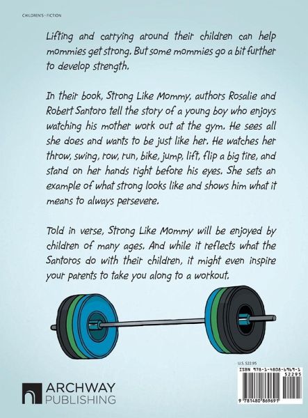 Lifting and carrying around their children can help mommies get strong. But some mommies go a bit further to develop strength. In their book, Strong Like Mommy, authors Rosalie and Robert Santoro tell the story of a young boy who enjoys watching his mother work out at the gym. He sees all she does and wants to be just like her. He watches her throw, swing, row, run, bike, jump, lift, flip a big tire, and stand on her hands right before his eyes. She sets an example of what strong looks like and shows him what it means to always persevere. Told in verse, Strong Like Mommy will be enjoyed by…mehr
