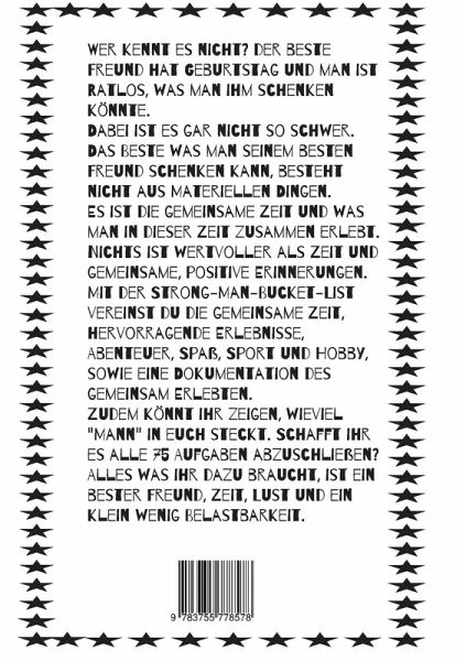 Wer kennt es nicht? Der beste Freund hat Geburtstag und man ist ratlos, was man ihm schenken könnte. Dabei ist es gar nicht so schwierig. Das beste was man seinem besten Freund schenken kann, besteht nicht aus materiellen Dingen. Es ist die gemeinsame Zeit und was man in dieser Zeit zusammen erlebt. Nichts ist wertvoller als Zeit und gemeinsame, positive Erinnerungen. Mit der Strong-Man-Bucket-List vereinst du die gemeinsame Zeit, hervorragende Erlebnisse, Abenteuer, Spaß, Sport und Hobby, sowie eine Dokumentation des gemeinsam Erlebten. Zudem könnt ihr zeigen, wieviel "Mann" in euch steckt. Schafft ihr es alle 75 Aufgaben abzuschließen? Alles was ihr dazu braucht, ist ein bester Freund, Zeit, Lust und ein klein wenig Belastbarkeit.