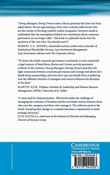 The family firm preparing generational change, the partnership that welcomes new partners, and the shareholders of a firm that chooses to go public are making decisions that will have an impact on strategy and management. Conversely, a change in strategy such as a move to diversify or a decision to take on more risk in a business can make the firm more attractive to some shareholders and less attractive to others and is therefore not ownership neutral. Opening the black box of agency theory, Korine and Gomez show how management and ownership interact to shape the strategy of the firm. In their view, the critical question to ask is not what is the best strategy, but rather, who is the strategy for? With numerous detailed examples, Strong Managers, Strong Owners is an invaluable resource for company owners, board members and executives, as well as their advisors in strategy and governance.