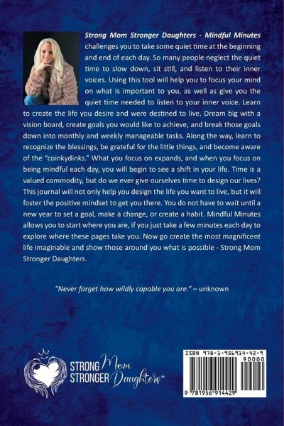 Strong Mom Stronger Daughters - Mindful Minutes challenges you to take some quiet time at the beginning and end of each day. So many people neglect the quiet time to slow down, sit still, and listen to their inner voices. Using this tool will help you to focus your mind on what is important to you, as well as give you the quiet time needed to listen to your inner voice. Learn to create the life you desire and were destined to live. Dream big with a vision board, create goals you would like to achieve, and break those goals down into monthly and weekly manageable tasks. Along the way, learn to recognize the blessings, be grateful for the little things, and become aware of the "coinkydinks." What you focus on expands, and when you focus on being mindful each day, you will begin to see a shift in your life. Time is a valued commodity, but do we ever give ourselves time to design our lives? This journal will not only help you design the life you want to live, but it will foster the positive mindset to get you there. You do not have to wait until a new year to set a goal, make a change, or create a habit. Mindful Minutes allows you to start where you are, if you just take a few minutes each day to explore where these pages take you. Now go create the most magnificent life imaginable and show those around you what is possible - Strong Mom Stronger Daughters.