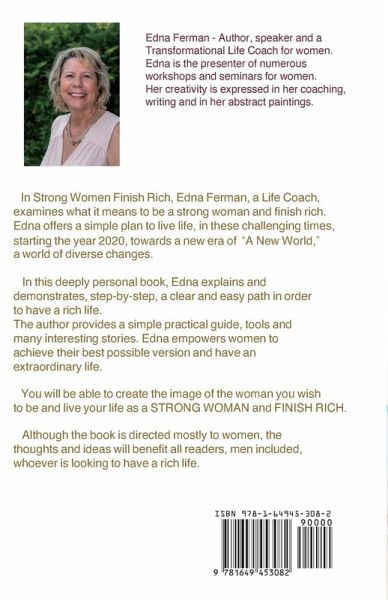 In Strong Women Finish Rich, Edna Ferman, a life coach, examines what it means to be a strong woman and finish rich.Edna offers a simple plan to live life, in these challenging times, starting the year 2020, towards a new era of "A New World," a world of diverse changes. In this deeply personal book, Edna explains and demonstrates, step-by-step, a clear and easy path in order to have a rich life. The author provides a simple practical guide, tools and many interesting stories. The book empowers women to achieve their best possible version and have an extraordinary life.You will be able to create the image of the woman you wish to be and live your life as a STRONG WOMAN and FINISH RICH. Although the book is directed mostly to women, the thoughts and ideas will benefit all readers, men included, whoever is looking to have a rich life.