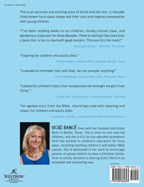 This is an accurate and exciting story of David and the lion. It includes little-known facts about sheep and their care and inspires conversation with young children. "I've been reading books to my children, Sunday school class, and elementary classroom for three decades. There is nothing I like more than a book that is fun to read with good content. This one hits the mark!" -Jenny Lynn Brewer - Memphis, Tennessee "Inspiring for children and adults alike." -Sheila Peebles, medical office manager, Murphy, Texas "A wonderful reminder that with God, we can conquer anything!" -Erica Huddleston, stay-at-home mom, Princeton, Texas "A beautiful children's story that incorporates the strength we gain from Christ." -Crystal Barr, US Army mom, Colorado Springs, Colorado "An ageless story from the Bible, charmingly told with meaning and import for children and adults alike. -Lindy Bell, member, Jane Austen Society of North America