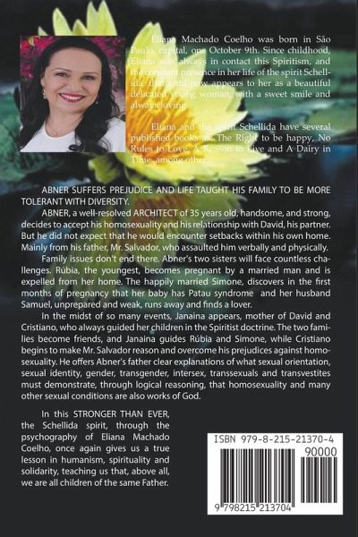 ABNER SUFFERS PREJUDICE AND LIFE TAUGHT HIS FAMILY TO BE MORE TOLERANT WITH DIVERSITY. ABNER, a well-resolved ARCHITECT of 35 years old, handsome, and strong, decides to accept his homosexuality and his relationship with David, his partner. But he did not expect that he would encounter setbacks within his own home. Mainly from his father, Mr. Salvador, who assaulted him verbally and physically. Family issues don't end there. Abner's two sisters will face countless challenges. Rúbia, the youngest, becomes pregnant by a married man and is expelled from her home. The happily married Simone, discovers in the first months of pregnancy that her baby has Patau syndrome and her husband Samuel, unprepared and weak, runs away and finds a lover. In the midst of so many events, Janaina appears, mother of David and Cristiano, who always guided her children in the Spiritist doctrine. The two families become friends, and Janaina guides Rúbia and Simone, while Cristiano begins to make Mr. Salvador reason and overcome his prejudices against homosexuality. He offers Abner's father clear explanations of what sexual orientation, sexual identity, gender, transgender, intersex, transsexuals and transvestites must demonstrate, through logical reasoning, that homosexuality and many other sexual conditions are also works of God. In this STRONGER THAN EVER, the Schellida spirit, through the psychography of Eliana Machado Coelho, once again gives us a true lesson in humanism, spirituality and solidarity, teaching us that, above all, we are all children of the same Father.